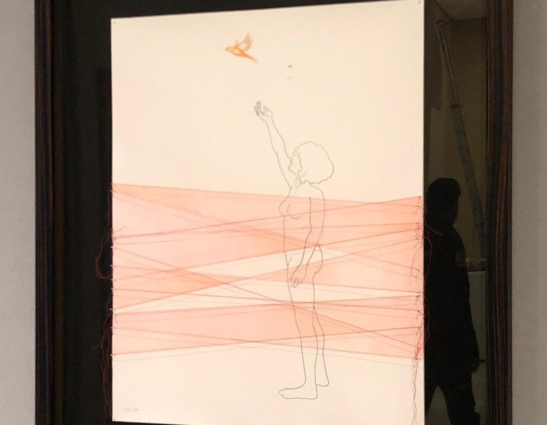 Respecte a la visibilitat de la teua faceta artística, has estat seleccionada per a l’exposició del Premi Senyera 2020 (encara pot visitar-se, al Museu de la Ciutat, fins al 28 de febrer), amb una obra molt subtil. En ella, treballes amb fils rojos sobre el dibuix, vetlant i revelant alhora allò íntim que es fa comú, on el propi cos es torna concepte, com pot veure’s també en altres treballs teus més complexos (Boicotempatía, per exemple). Aquest concepte apareix al cartell amb el qual la dissenyadora Ana Pastor i tu heu guanyat el segon accèssit del I Premi Internacional de Cartells MAKMA al MuVIM, també exposat al públic, a la Sala Parpalló, fins a finals de febrer. ¿Quins aspectes formals i conceptuals del teu treball recent creus que s’han vist ampliats en posar-los en comú amb altres persones, i en concret, amb la mirada de la teua col·lega i “camarada” Ana Pastor? Com va ser el vostre procés creatiu?